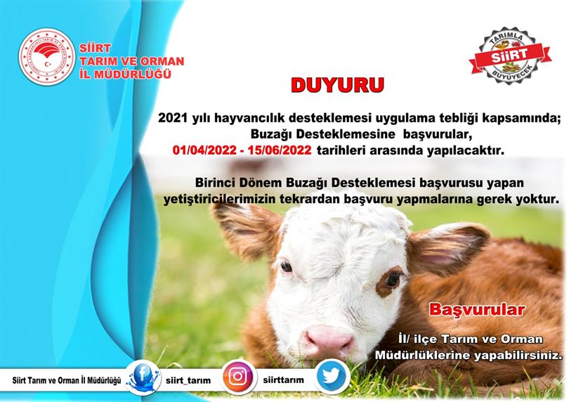 2021 yılı hayvancılık desteklemesi uygulama tebliği (2021/43) kapsamında "2. Dönem Buzağı Desteklemesi" başvuruları 01.04.2022 – 15.06.2022 tarihleri arasında yapılacaktır.