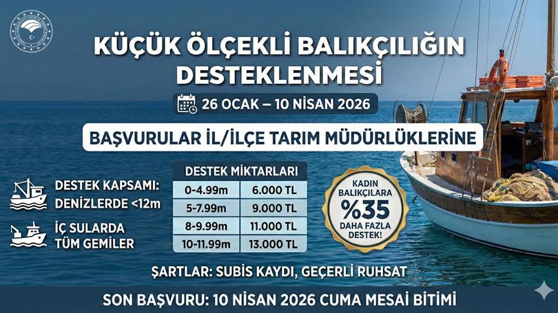 Deniz ve iç sulardaki küçük ölçekli balıkçı gemilerinin av, avcılık ve sosyo-ekonomik verilerinin toplanması ve sürdürülebilir yönetiminin sağlanması amacıyla, 26 Ocak 2026 Pazartesi günü başlayan destekleme başvuruları 10 Nisan 2026 Cuma günü mesai bitiminde sona erecektir.